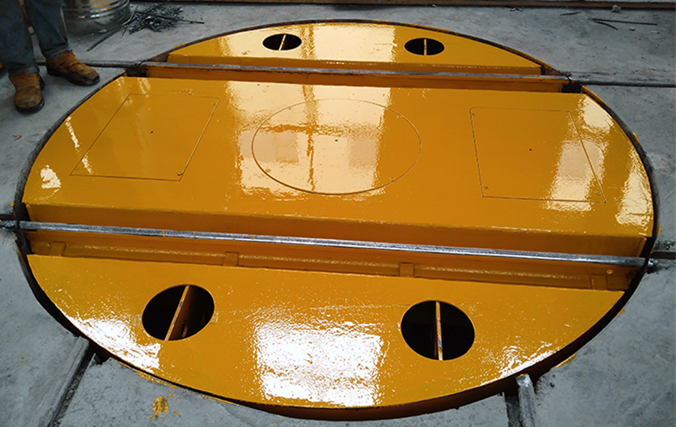 輪對通過扁擔軸承座安裝在車架橫梁下,每側四根螺栓固定,這種結構可有效降低臺面高度,增強橫向穩定性,提高承載力,提高框架受力??蚣苁怯伤母v梁、幾根橫梁和鋪板焊接而成的框架結構。大型槽鋼通常用作框架的縱梁和橫梁,承載八點,框架受力均勻。輪對上的扁擔軸承座通過螺栓與框架連接,這樣可以很好地降低臺面高度。